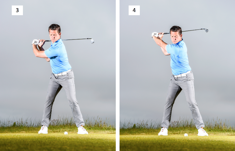 Finally, push your arms out to 10 o’clock to add width and extension. You are now rotated, with your wrists hinged and your weight positioned powerfully to move into impact.