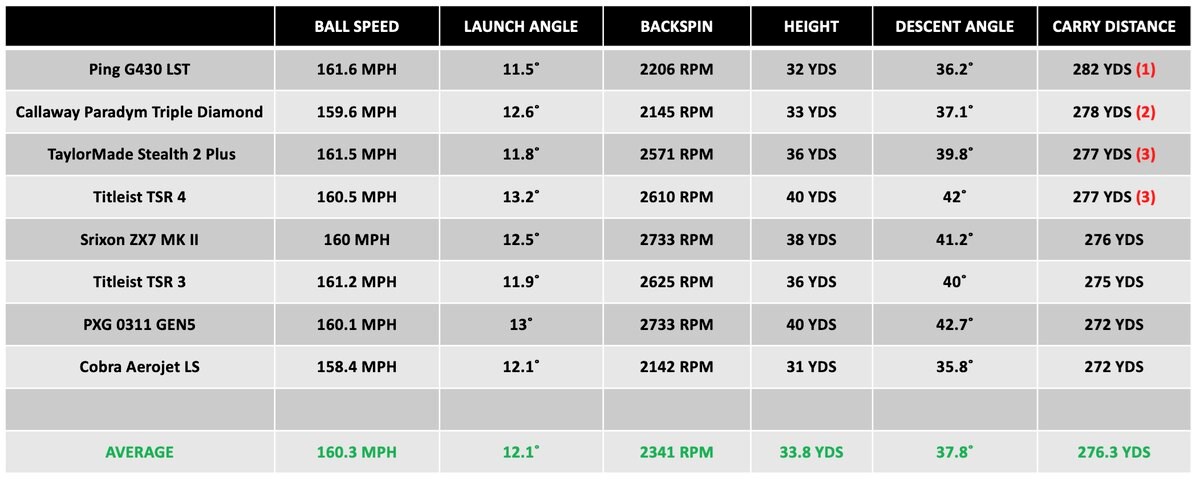 | Ping G430 LST | 161.4 MPH | 9.7° | 2301 RPM | 28 YDS | 35.1° | 270 YDS | 246.4 SQ YDS (3) |