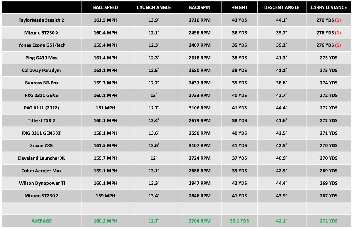 | Mizuno ST-G (9.5° – Back Weights) | 162 MPH | 9.1° | 2109 RPM | 24 YDS | 31.3° | 268 YDS | 442 SQ YDS |
