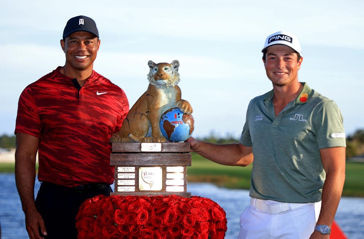 Viktor Hovland poses with Tiger Woods after winning the Hero World Challenge in Albany.