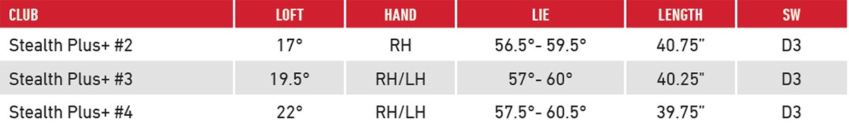 Lofts: 17° - #2 / 19.5° - #3 / 22° - #4