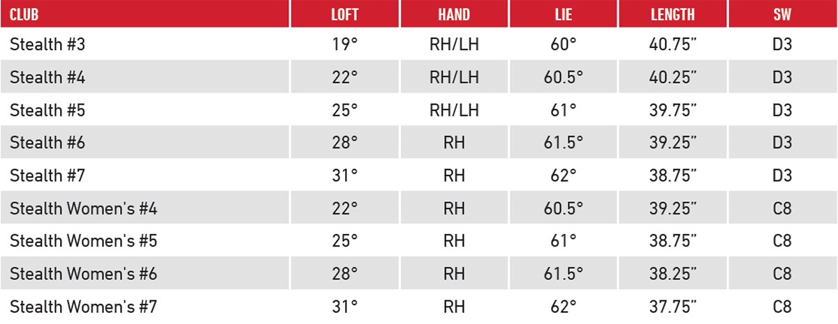 The women’s version of the Stealth Rescue features a stand-alone bright silver PVD sole and a dark silver crown, as well as lighter heads and higher lofts.