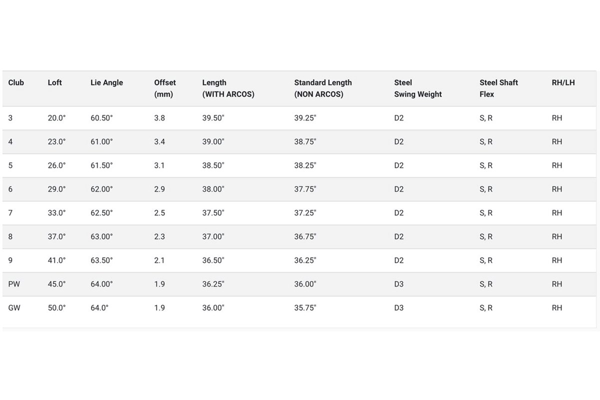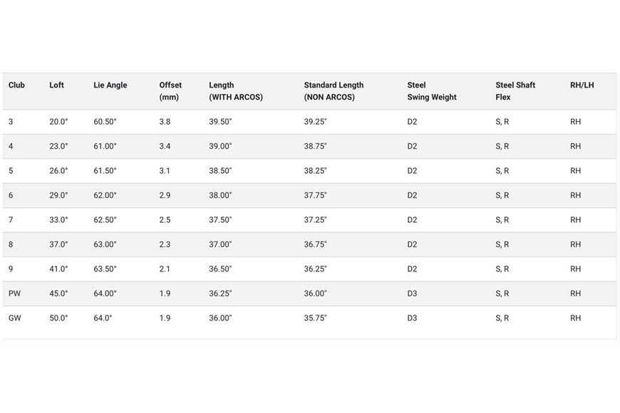 Iron lofts: 3 (20º), 4 (23º), 5 (26º), 6 (29º), 7 (33º), 8 (37º), 9 (41º), PW (45º), GW (50º)