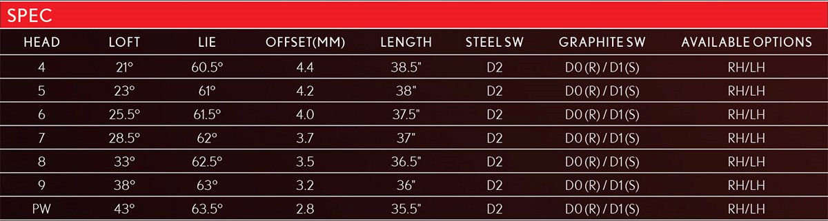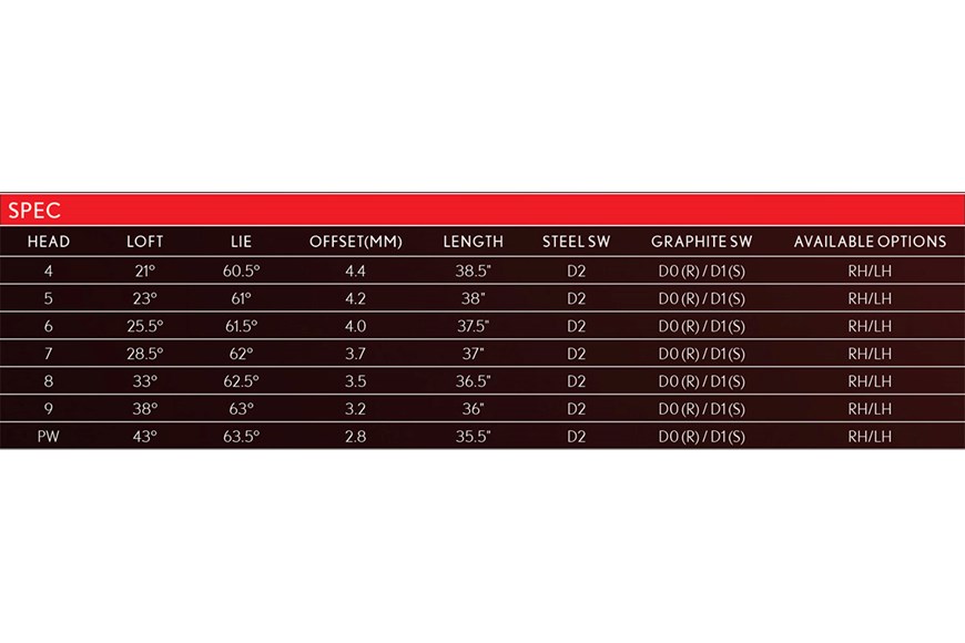 The 4-iron to 7-iron feature wider grooves, ideal for longer shots in all conditions, while the 8-iron to Pitching Wedge have deeper, closer set grooves, perfect for cutting through vrass and debris on appraoch shots.