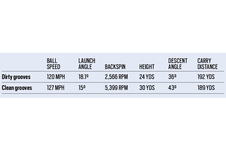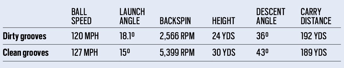 Shots with dirty grooves lost 7mph of ball speed – 5.5% of our tester’s total – which is huge. Backspin (essentially control) fell a jaw-dropping 52.5% (to 2,566rpm from 5,399rpm), as did height (down six yards, or 20%) and descent angle (down 16.3%; 7°).
