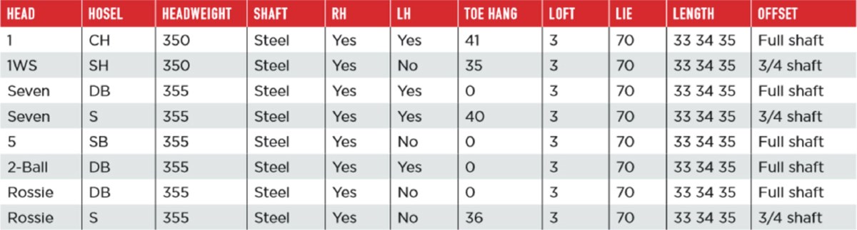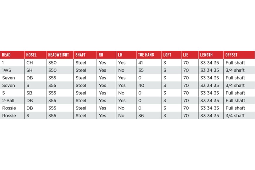 The new range, with its rich silver PVD finish and finely milled surfaces, offers a putter to suit every golfer – 1 blade, 1WS wide-soled blade, smaller mallet 5, fanged 7, classic 2-Ball and wider mallet Rossie. Both the Rossie and 7 are available in either double bend face-balanced models or with slant necks and a degree of toe hang.