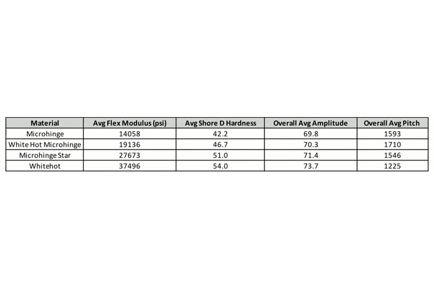 “As we looked deeper at the material properties with our golf ball team, we noticed a difference in flex modulus, so even in a given hardness the flex could vary from one material to the next and that’s where White Hot was unique. The flex modulus along with the hardness creates this almost magic formula.” See the graphic below for a direct comparison with Odyssey’s other putter faces.