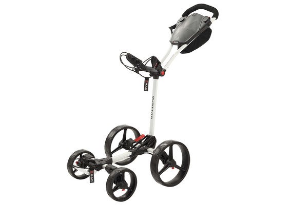 What we say: The latest in the Fold Flat range combines four-heel stability with innovative folding and storage. All four wheels fold automatically under the body so it stores with ease. On the course it will remain stable on the toughest terrain and has neat features such as foot brake, storage compartment, adjustable brackets and adjustable handle. Available in white, white/red, phantom/lime, phantom.