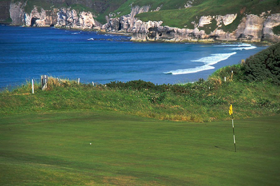 The view walking down the fairway to this gorgeous green framed by the water, with Dunluce Castle beyond, are superb.