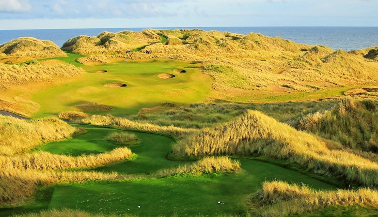 Feeling pleased with the world, you then play across the site when the 13th comes into view. Walking off the back of its sloping green, you pass between a little gap between the dunes and emerge to a dramatic scene. It feels as if you have passed through an archway to the Secret Garden; ahead of you a strip of fairway wriggles between flanks of dunes the size of which raises the eyebrows. It is not difficult to understand why Trump rates it as his favourite hole, because if you enjoy the spectacular, you’ll love the 14th.