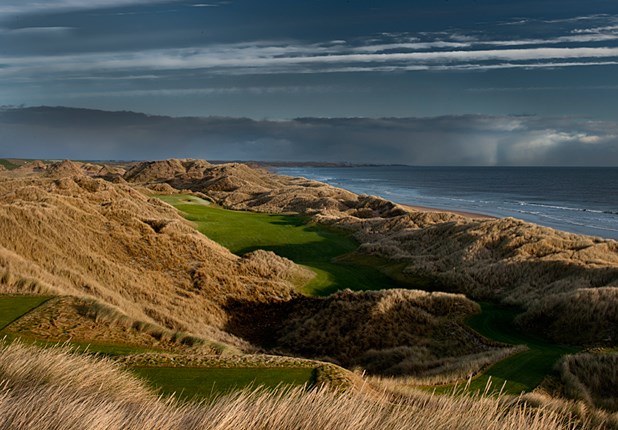 It is often nice to catch glimpse of the course during a drive to the clubhouse; a little appetiser of what is to come. But equally, it is a nice surprise to have seen nothing before boarding the 1st tee. That is the case at Trump International and few will be disappointed by the sight of this opening hole, with huge dunes lining both sides of the fairway. Trump waxed lyrical about “the great dunes” as he constructed the links, and he was not exaggerating; this is awesome terrain, the like of which is not seen elsewhere in Scotland – and especially not on the east coast. Wind and water currents mean the biggest dunes are usually found on west coasts – think of Ballybunion compared to Portmarnock, or Hillside relative to Brancaster – yet only in (east coast) Aberdeenshire are they anywhere near this size in Scotland. Trump Links has the highest, at up to 130ft, and as you gaze down the 1st you cannot believe these dunes are not the site’s largest.