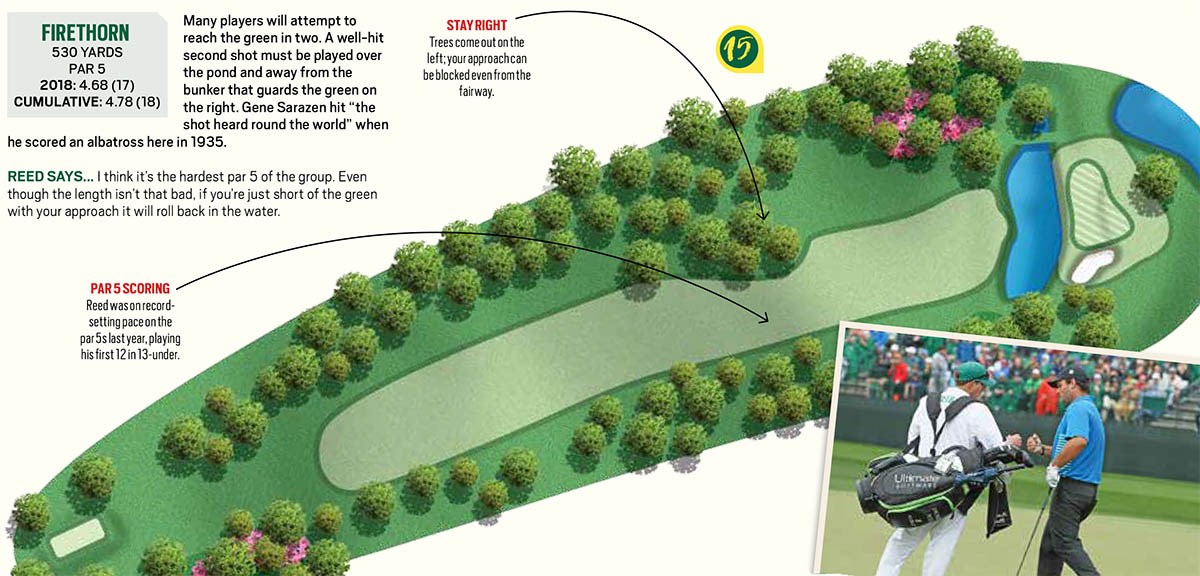 To score well on 18 you need to avoid these green side bunkers and understand the pin locations and where to land the ball, with the green having two distinct tiers. The scoring average is 4.23 making it the seventh hardest on the course and maybe made slightly harder with the pressure of the final hole at The Masters and the hundreds of patrons that surround the green.