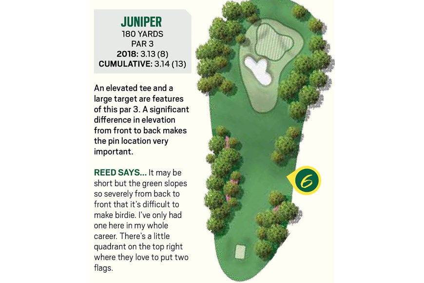 The green has protection from a large bunker at the front left, but shouldn’t come into play too much with a couple of the pin positions, as they favor a shelf in the top right of the green. It can be hard to birdie but with it being more straightforward than a few holes getting on the green and two-putting should be easy for most players. A scoring average of 3.14 (13) means the sixth is one of the easier holes around Augusta National.