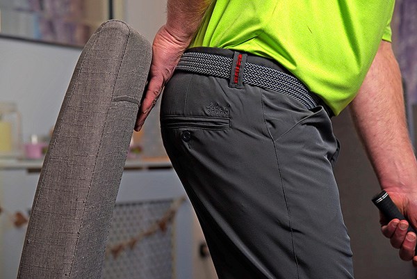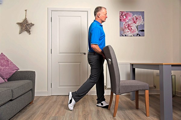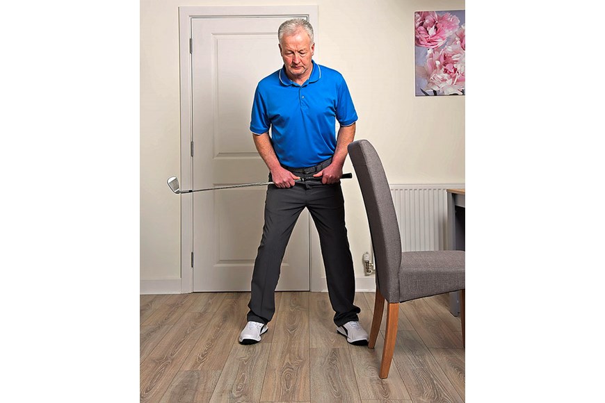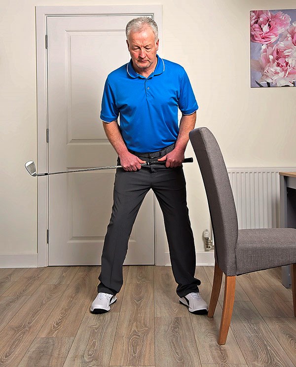 Here is a great drill to help you feel the correct trunk and body rotation coming into impact. All you need is a mid-iron and a chair. Place the chair off your lead foot and hold the handle of the club across your hips, as shown.