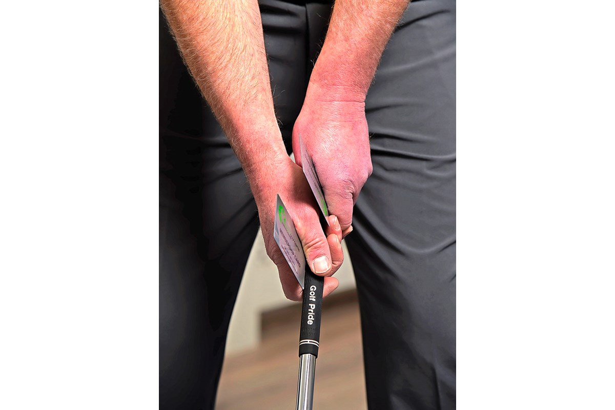 Take the first card and pinch it in the “webbing” between the thumb and first finger of your lead hand. Now do the same with the second card and your trail hand. This forces you to keep some pressure between the thumbs and forefingers of both hands – a key trait of a good grip, and one that helps you put your hands on the club in the correct position.
