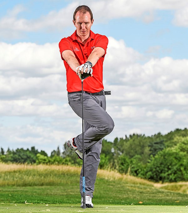 Place you driver in front of you, grip-down. Rest your palms on the clubhead, arms outstretched. Bend your trail knee across your lead leg and hook the foot behind it as shown. Using the driver as support, twist gently back and through. Switch legs to work on both sides of your pelvis.