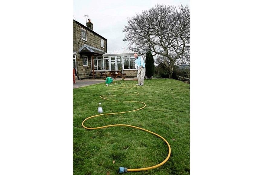 Arrange your hose into a series of even turns, as shown. This serpent shape creates zones which will become your landing areas for this drill. Now collect a group of balls – gardens permitting, I’d use real ones here because this is a feel drill.