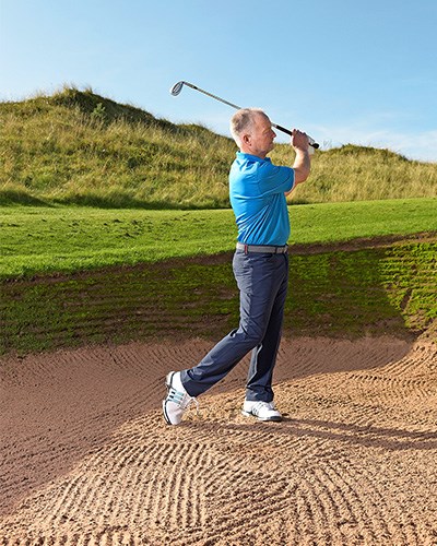 ➤ Stand Squarer: Forget everything you’ve been told about opening up your stance and clubface. Yes, the greenside bunker shot works best from a very slightly open position, but do not overdo it. Adopt a square position, open the face fractionally, then pull your lead foot back a touch to open your stance. This will allow you to make a much more orthodox swing, with some assistance to launch created by cutting across the ball very slightly.