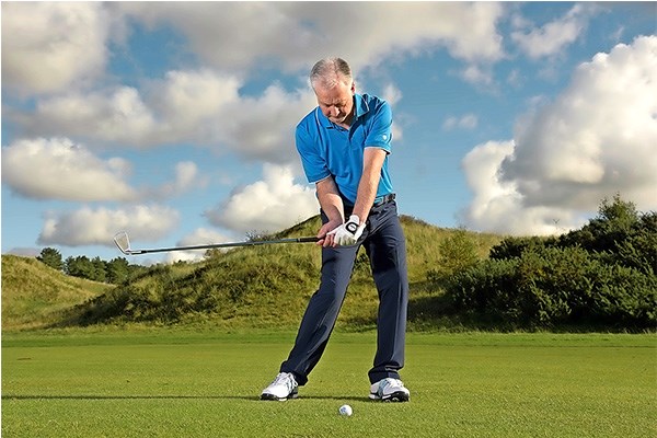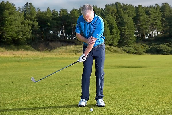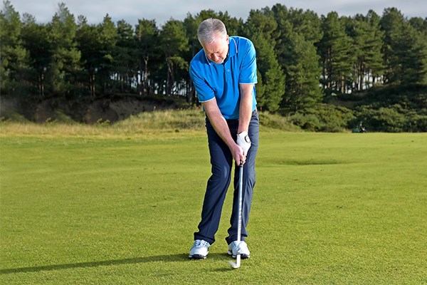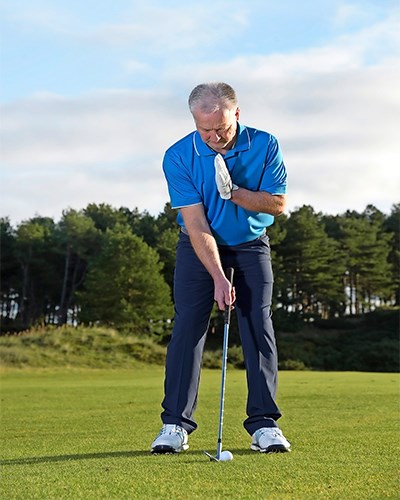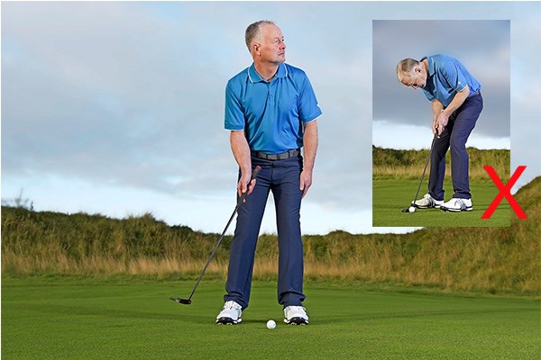 ➤ Avoid this: Compare that open, information gathering posture to this closed, ball-bound one. If you find yourself indulging in a spot of ball-sniffing when you set up, get your attention up, out and away from the ball. Stand taller, let your arms hang more and spend more time looking at the hole.