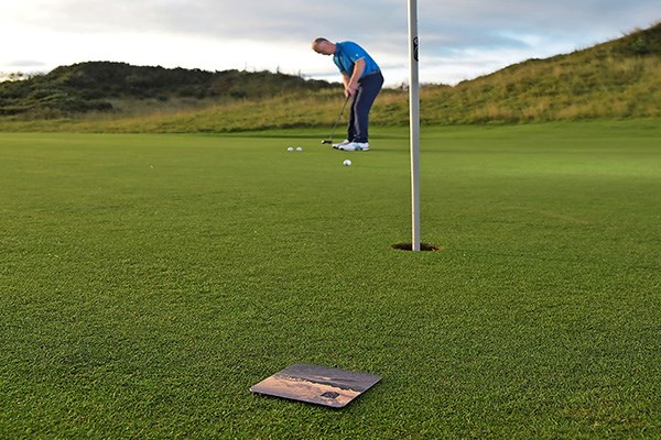 ➤ New Target: On the course you will have to visualise this point, but you can help yourself in practice by positioning an object – here I’m using a beer mat – behind the hole. Putt to that distant target and you will find yourself getting hole-high much more often.