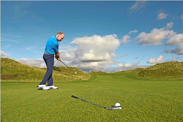➤ Try it for real: Now take your regular grip and stance, but aim to swing the club with that same one- lever concept in mind. You’ll note that as you do this, you create some slight forward lean in the clubshaft through the ball – perfect for delivering a slightly downward blow that promotes clean, crisp contact.