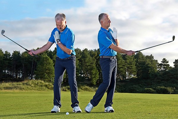 ➤ Unified motion: Now swing the lever forward. Again, feel the shoulder, hands and clubshaft moving as one unit. Keep your lead wrist firm through to the end of the action; the glove badge and clubface remain facing the target through to the end of this short action.