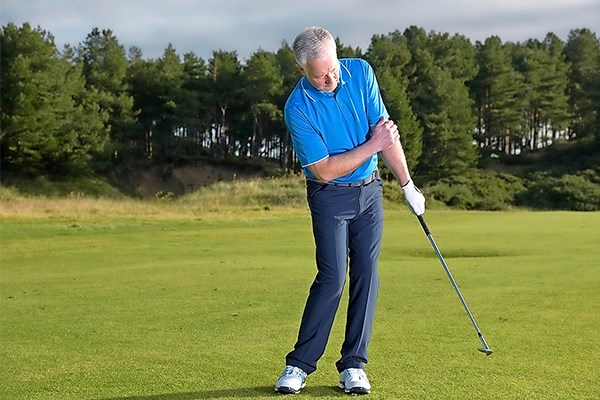 ➤ Single Lever: The simplest chipping action involves moving one lever, which we can think of as lead shoulder to the clubhead. To feel this lever in action, grip the club with your lead hand only. Hold the elbow with your trail hand as shown. Move the club and arm back as one, 2 single unit, allowing some softness in the wrists.