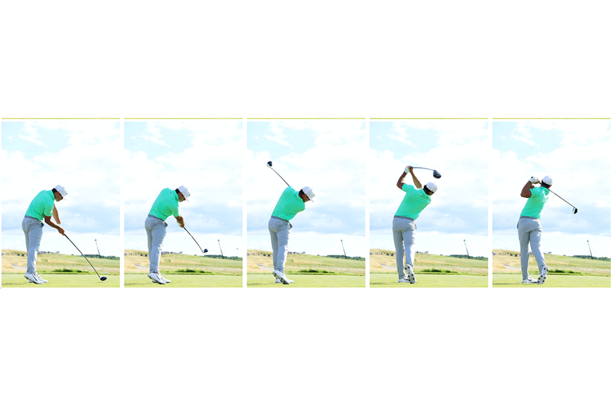 To combat the closed clubface we saw earlier, Brooks releases the right hand under the left, which makes it easier to hit a power fade.