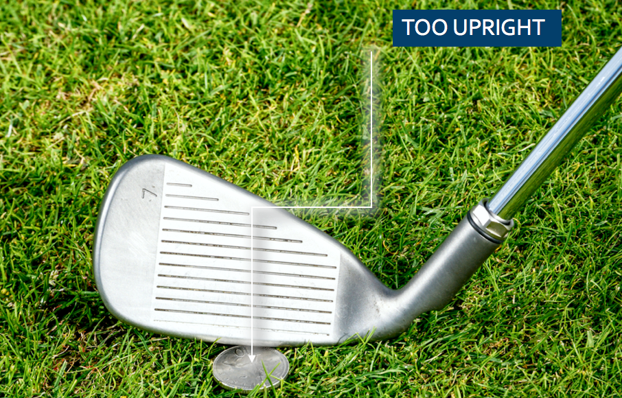Take your regular address position. If there’s room to push the coin under the centre of the face, the club is too upright.