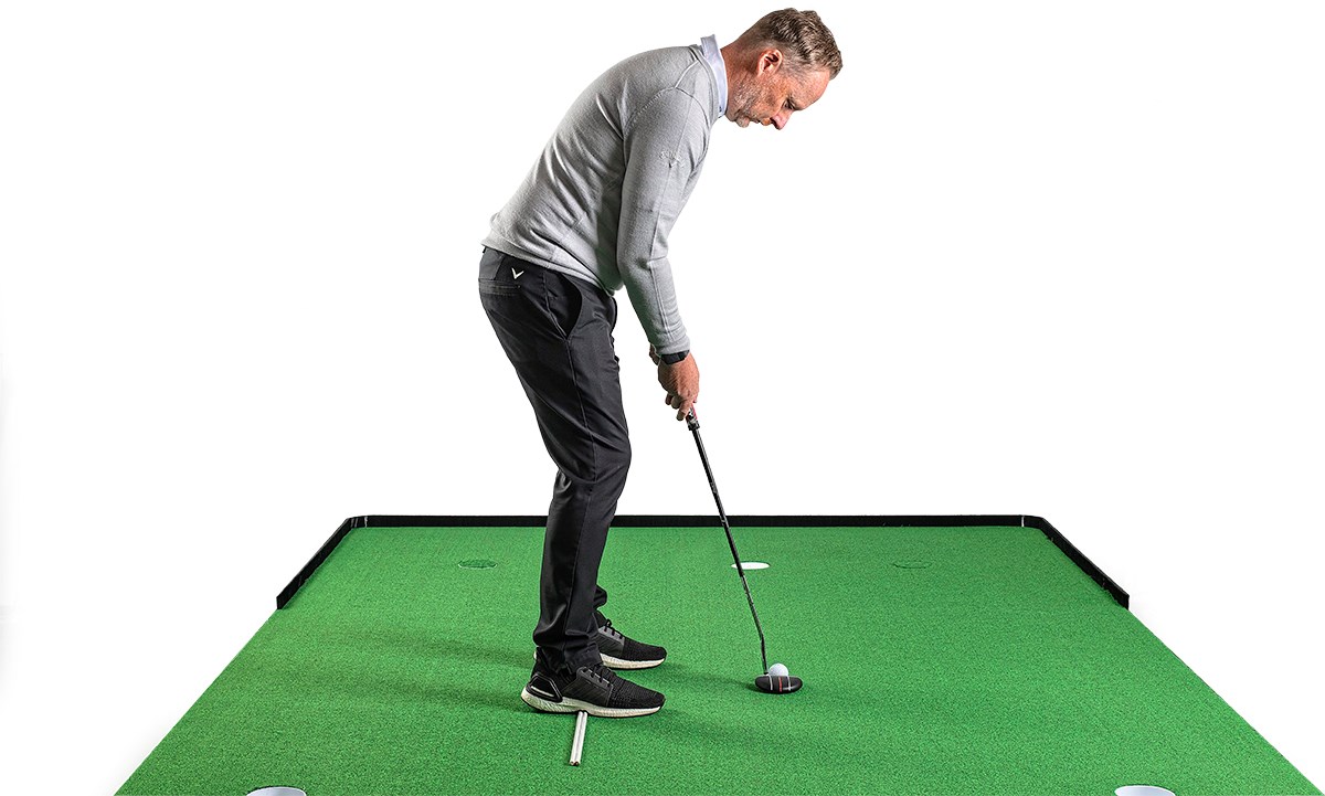 2. If you are someone who sets up with their weight too much on the balls of your feet, you will feel yourself rolling or tipping forwards as you take your posture. This is a great exercise to establish any biases and to build a stable putting stroke from the ground up.