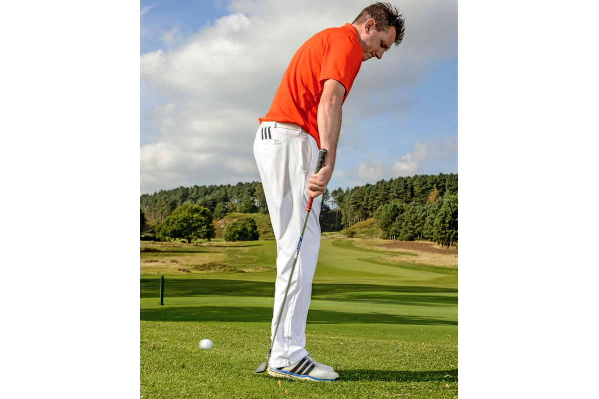 Play the ball opposite the toe-cap of your shoes, with the ball as close to your toe as possible. This helps you work the shoulder in a more comfortable back-through path. Use your shoulder’s natural pivot to take the club back, again keeping wrist action out of the shot.
