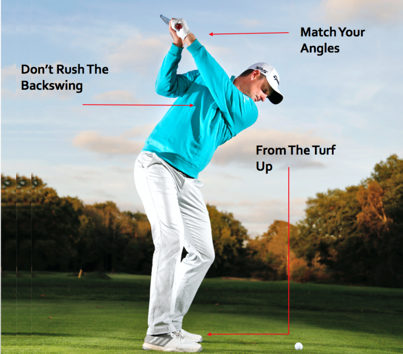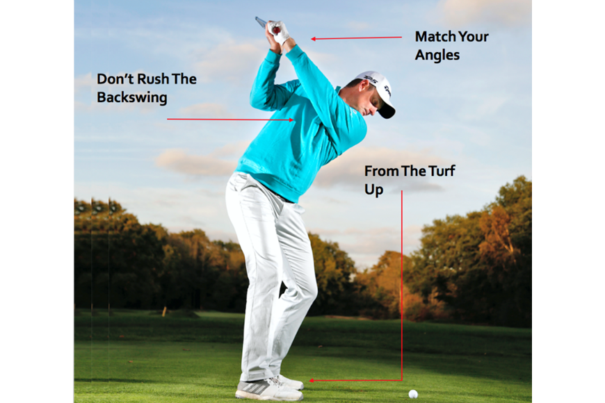 If you think ‘hit’ from the top, the upper body moves first and you cast the club over the top, outside the neutral plane. It can lead to a slice. The downswing starts from the ground up so the club stays on a neutral plane and you have an inside ‘attack’