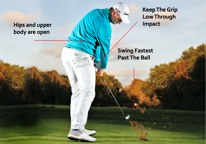 Imagining the fastest part of your swing is past the ball helps maintain the lag and release the energy when you need it. This helps attack the ball from the inside and with a downward attack angle so you really compress it, transfer maximum power and produce a high and penetrating trajectory.